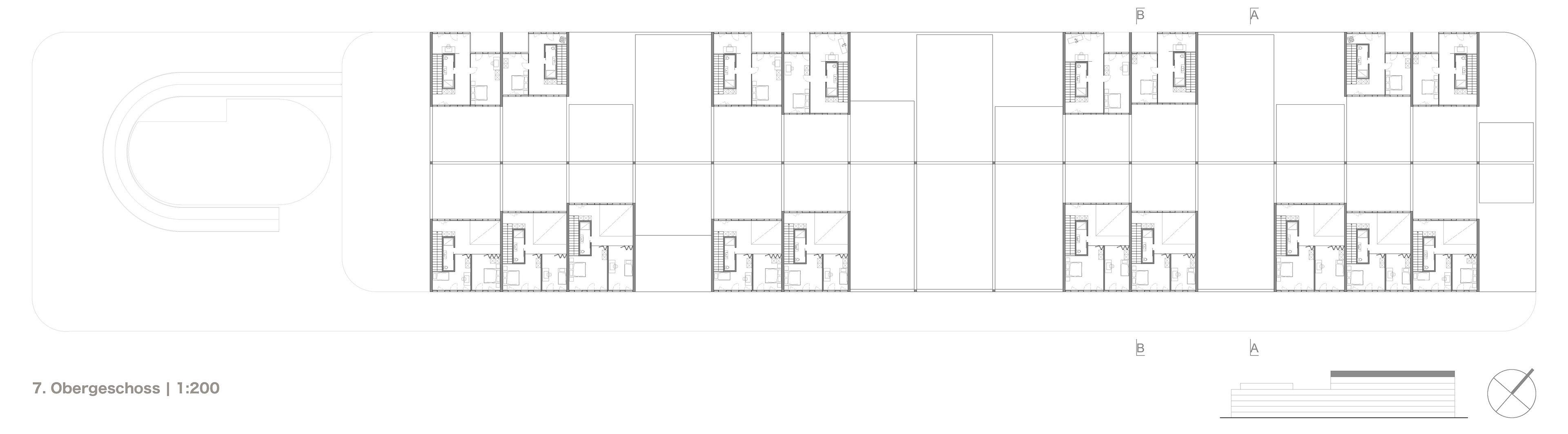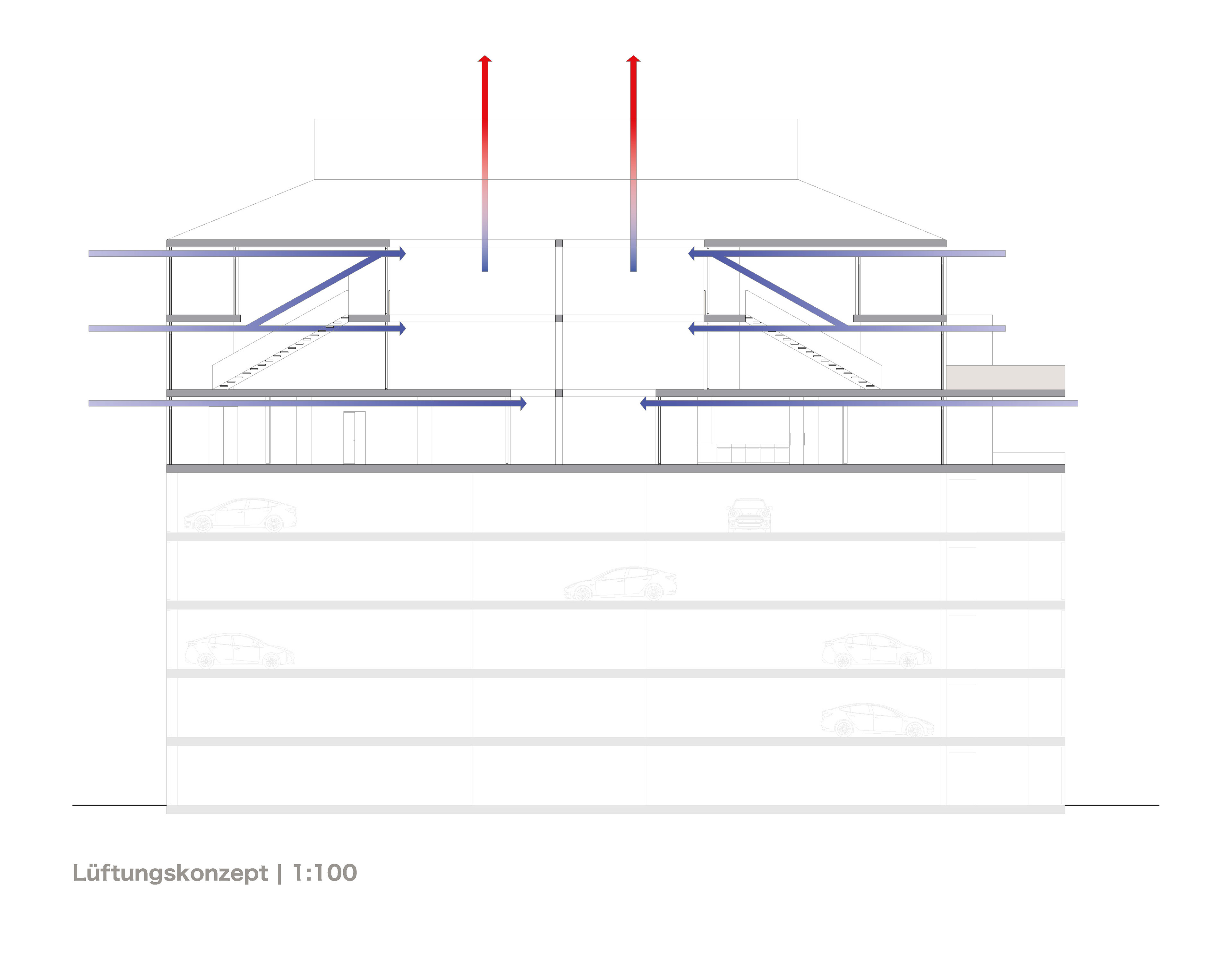 Ein markantes Merkmal unseres Projekts ist das durchdachte Klimatisierungs- und Belüftungskonzept, dessen Prinzipien sich im Grundriss der Wohnungen widerspiegeln. Dieses System, entworfen, um eine natürliche Belüftung und Beheizung zu ermöglichen, nutzt ein innovatives Zwischenklima zwischen den Wohnungen. Während im Sommer die Sonneneinstrahlung zur Kühlung beiträgt, hilft im Winter das Zwischenklima bei der Wärmeerzeugung. Der Grundriss ist so konzipiert, dass er diese Belüftungstechnik unterstützt, wobei das Ziel einer natürlichen Luftzirkulation und eines angenehmen Wohnklimas angestrebt wird, allerdings unter Berücksichtigung der praktischen Grenzen solcher Systeme.